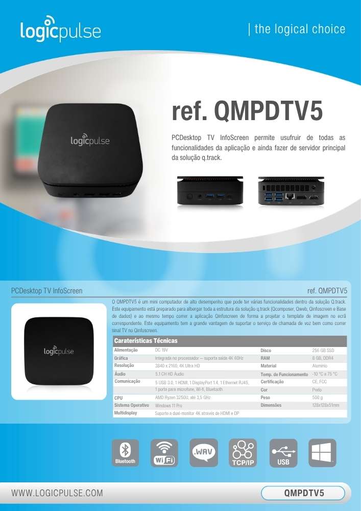 The QMPDTV5 is a mini high-performance computer that can have several features within the Q.track solution. This unit is ready to host the entire structure of q.track solution (Qcomposer, Qweb, Qinfoscreen and Database) while running the Qinfoscreen application in order to project the image of the corresponding screen template.This equipment has the advantage of supporting the voice call service as well as running TV signal in Qinfoscreen.