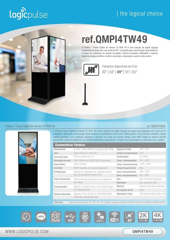 - Optional: Other screen sizes – 32", 43", 55", 65"; Android operating system; 4K 3840×2160 PX; Touch screen ref. QMPI4TW49T