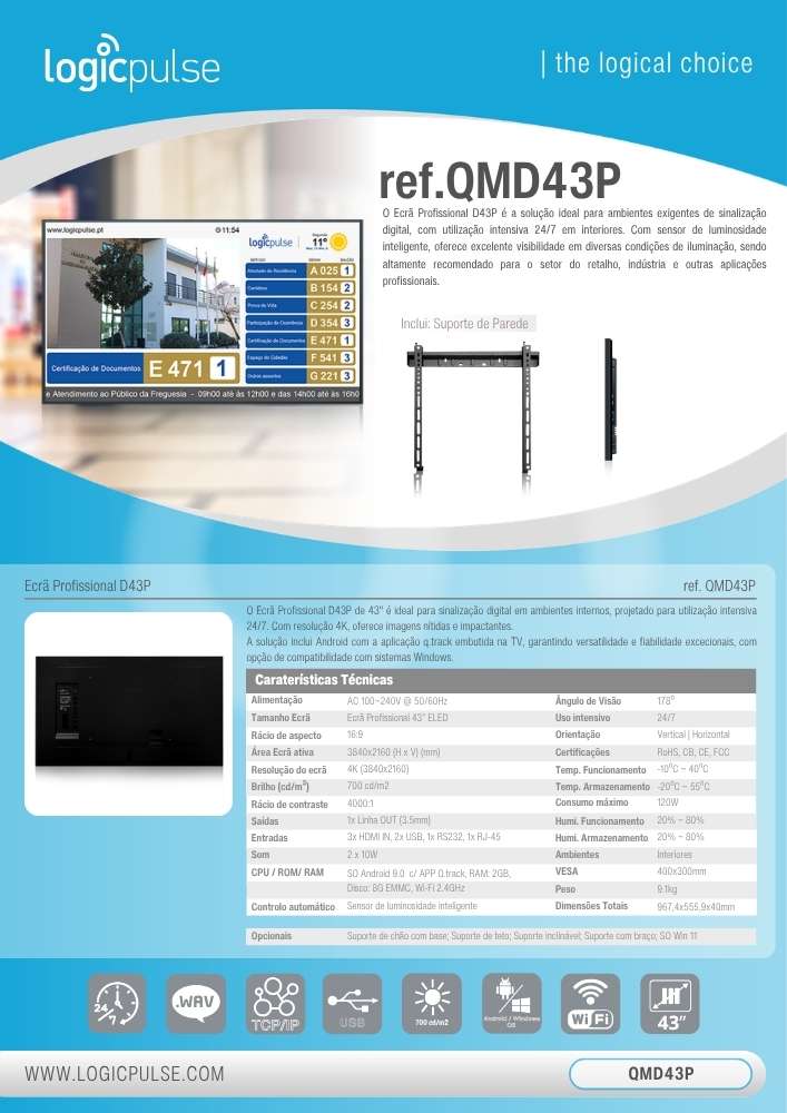 La Pantalla Profesional D43P de 43" es ideal para señalización digital en entornos interiores, diseñada para un uso intensivo 24/7. Con resolución 4K, ofrece imágenes nítidas e impactantes. La solución incluye Android con la aplicación q.track integrada en la TV, garantizando una versatilidad y fiabilidad excepcionales, con opción de compatibilidad con sistemas Windows.