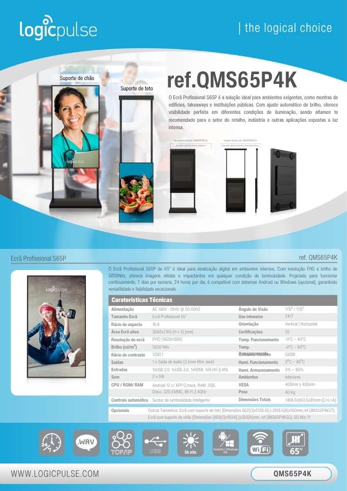 La Pantalla Profesional S65P de alta luminosidad, 65’’, es ideal para señalización digital en interiores. Con resolución FHD y brillo de 5000Nits, ofrece imágenes más nítidas e impactantes en cualquier condición de iluminación. Diseñada para funcionar de forma continua, 7 días a la semana, 24 horas al día, es compatible con sistemas Android o Windows (opcional), garantizando una versatilidad y flexibilidad excepcionales.