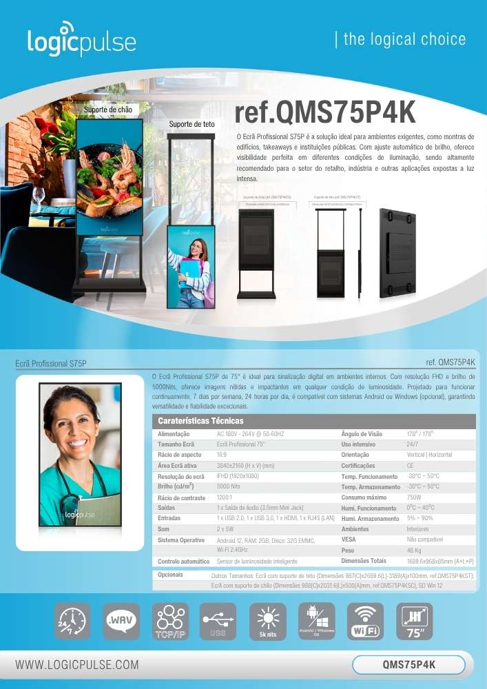 La Pantalla Profesional S75P de alta luminosidad, 75", es ideal para señalización digital en entornos interiores. Con resolución FHD y un brillo de 5000 Nits, ofrece imágenes nítidas e impactantes en cualquier condición de iluminación. Diseñada para funcionar de forma continua, 7 días a la semana, 24 horas al día, es compatible con sistemas Android o Windows (opcional), garantizando una versatilidad y fiabilidad excepcionales.