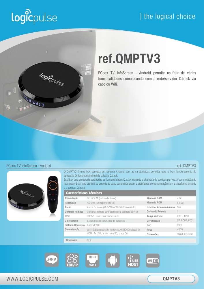 El QMPTV3 es una box basada en sistema Android con las características perfectas para el correcto funcionamiento de la aplicación Qinfoscreen- Android de la solución Q.track. Esta box está preparada para todas las funcionalidades de Q.track, incluyendo la llamada de servicios por voz. La comunicación de red puede realizarse vía Wifi o mediante cable, garantizando así la viabilidad de comunicación con la plataforma de red y el servidor Q.track.