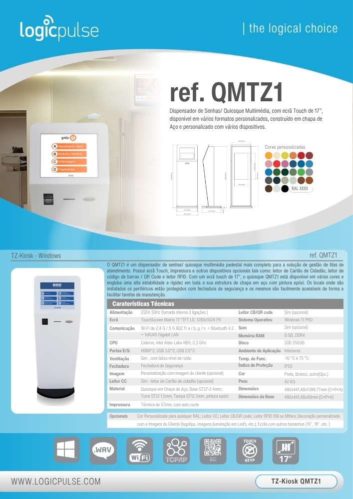 El QMTZ1 es un dispensador de turnos / quiosco multimedia de pedestal más completo para soluciones de gestión de colas. Dispone de pantalla táctil, impresora y otros dispositivos opcionales como lector de DNI, lector de códigos de barras / QR y lector RFID. Con una pantalla táctil de 17”, el quiosco QMTZ1 está disponible en varios colores y ofrece alta estabilidad y rigidez en toda su estructura de chapa de acero con pintura epoxi. Las zonas donde se instalan los periféricos están protegidas con cerradura de seguridad y son fácilmente accesibles para facilitar las tareas de mantenimiento.
