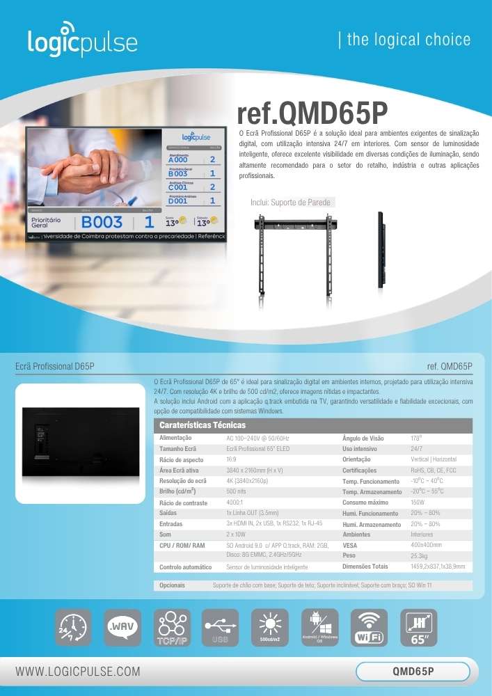 L’Écran Professionnel D65P de 65" est idéal pour la signalisation numérique en environnements intérieurs, conçu pour une utilisation intensive 24/7. Avec une résolution 4K et une luminosité de 500 cd/m², il offre des images nettes et percutantes. La solution inclut Android avec l’application q.track intégrée dans la télévision, garantissant une polyvalence et une fiabilité exceptionnelles, avec une option de compatibilité avec les systèmes Windows.