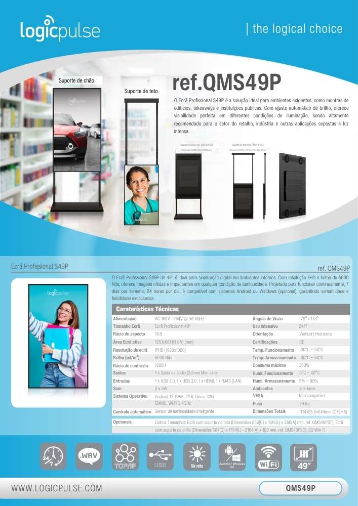 L’Écran Professionnel S49P haute luminosité est la solution idéale pour les environnements exigeants, tels que les vitrines d’immeubles, les takeaways et les institutions publiques. Avec un réglage automatique de la luminosité, il offre une visibilité parfaite dans différentes conditions d’éclairage, étant fortement recommandé pour le secteur du commerce de détail, l’industrie et d’autres applications exposées à une lumière intense.