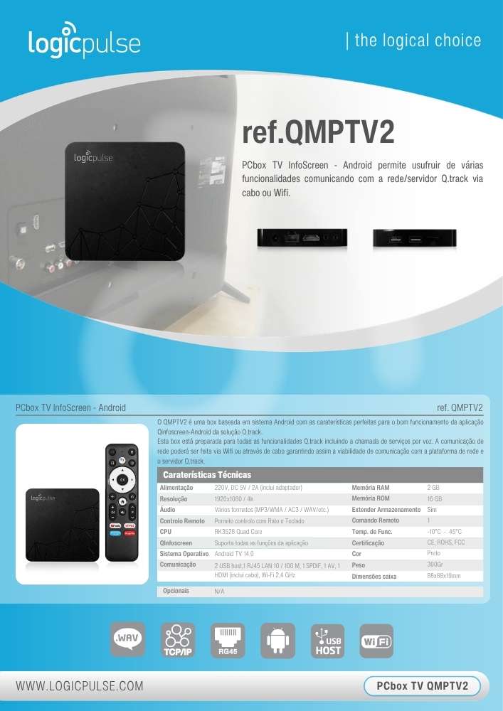 Le QMPTV2 est un boîtier basé sur le système Android, doté de fonctionnalités optimisées pour garantir le bon fonctionnement de l’application QInfoscreen-Android de la solution Q.track. Ce boîtier est préparé pour toutes les fonctionnalités Q.track, y compris l’appel de service par voix. La communication réseau peut être effectuée via Wi-Fi ou câble réseau, garantissant une fiabilité totale avec la plateforme et le serveur Q.track.