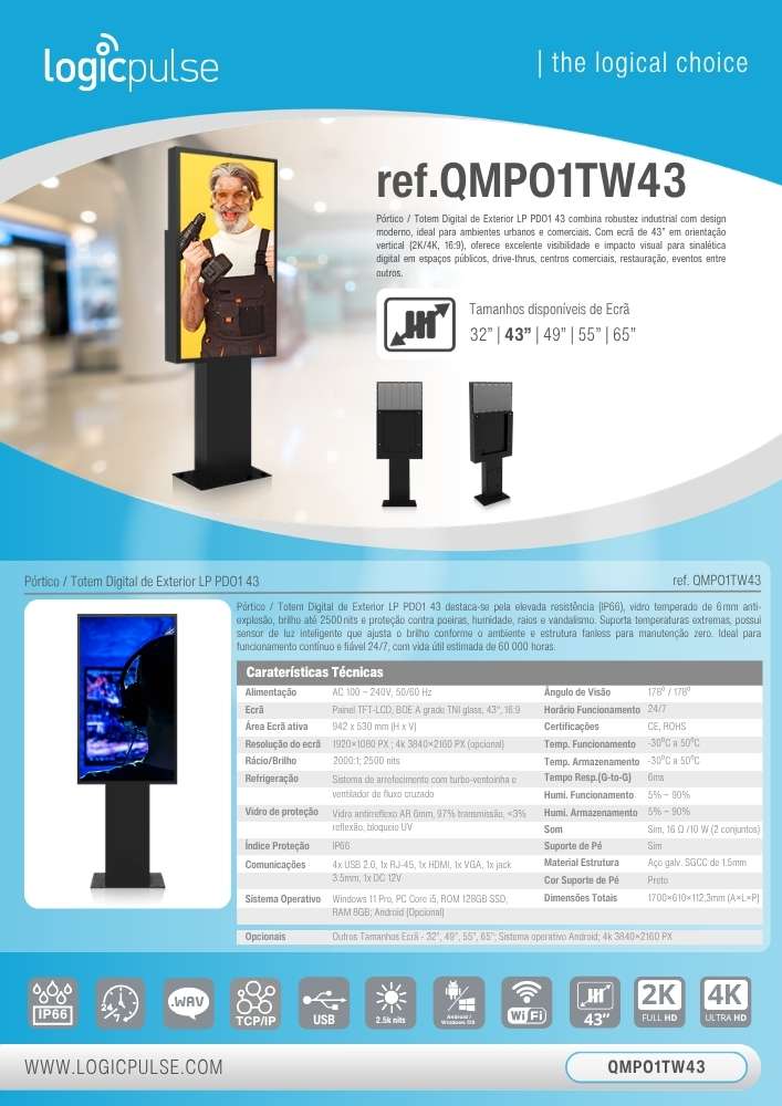 Totem Digital / Numérique d’Extérieur LP PDO1 43 combine robustesse industrielle et design moderne, idéal pour les environnements urbains et commerciaux. Doté d’un écran vertical de 43” (2K/4K, 16:9), il offre une excellente visibilité et un fort impact visuel pour l’affichage numérique dans les espaces publics, drive-thrus, centres commerciaux, restauration, événements, entre autres.