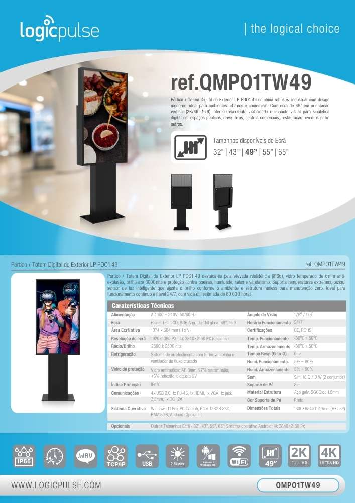 Totem Digital / Numérique d’Extérieur LP PDO1 49 combine robustesse industrielle et design moderne, idéal pour les environnements urbains et commerciaux. Doté d’un écran vertical de 49” (2K/4K, 16:9), il offre une excellente visibilité et un fort impact visuel pour l’affichage numérique dans les espaces publics, drive-thrus, centres commerciaux, restauration, événements, entre autres.