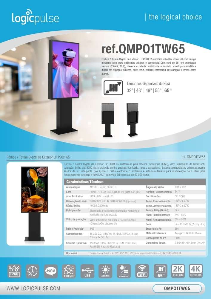 Totem Digital / Numérique d’Extérieur LP PD01 65 combine robustesse industrielle et design moderne, idéal pour les environnements urbains et commerciaux. Doté d’un écran vertical de 65” (2K/4K, 16:9), il offre une excellente visibilité et un fort impact visuel pour l’affichage numérique dans les espaces publics, drive-thrus, centres commerciaux, restauration, événements, entre autres.