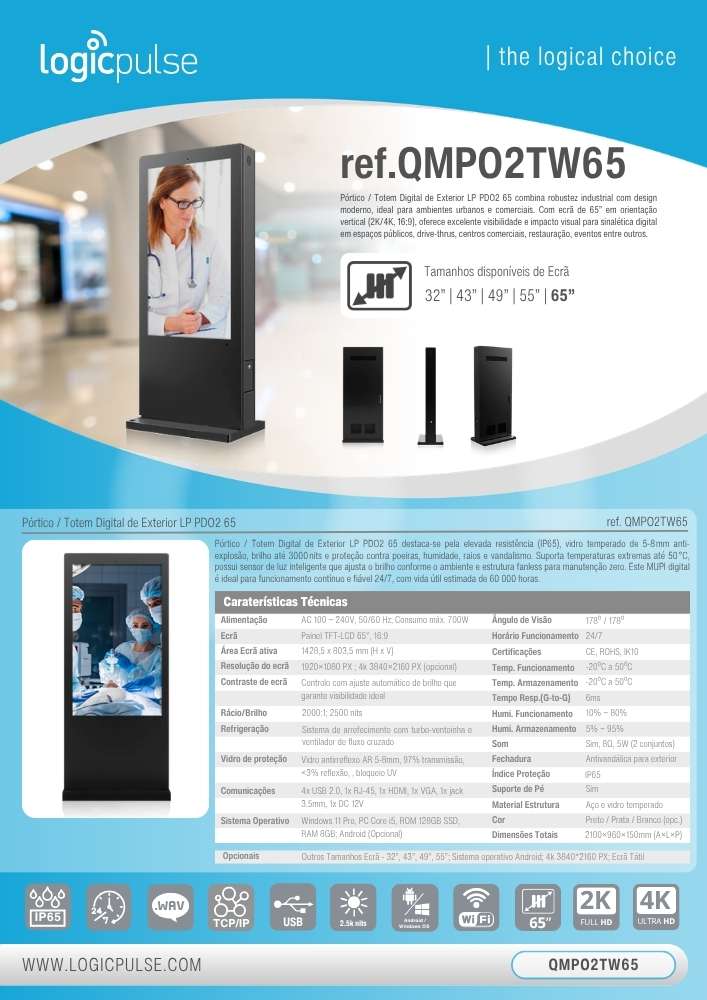 Le Totem Digital / Numérique d’extérieur LP PDO2 65 combine une robustesse industrielle avec un design moderne, idéal pour les environnements urbains et commerciaux. Avec un écran de 65” en orientation verticale (2K/4K, 16:9), il offre une excellente visibilité et un fort impact visuel pour l’affichage dynamique dans les espaces publics, les drive-thrus, les centres commerciaux, la restauration, les événements, entre autres.