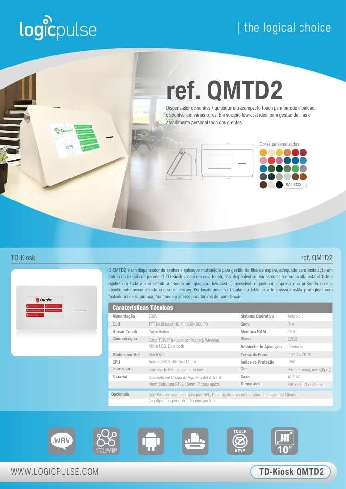 Le QMTD2 est un distributeur de tickets / borne multimédia pour la gestion des files d’attente, adapté à une installation sur comptoir ou à une fixation murale. Le TD-Kiosk dispose d’un écran tactile, est disponible en plusieurs couleurs et offre une grande stabilité et rigidité dans toute sa structure. En tant que borne à faible coût, il est accessible à toute entreprise souhaitant gérer l’accueil personnalisé de ses clients. Les zones où la tablette et l’imprimante sont installées sont protégées par des serrures de sécurité, facilitant l’accès pour les opérations de maintenance.