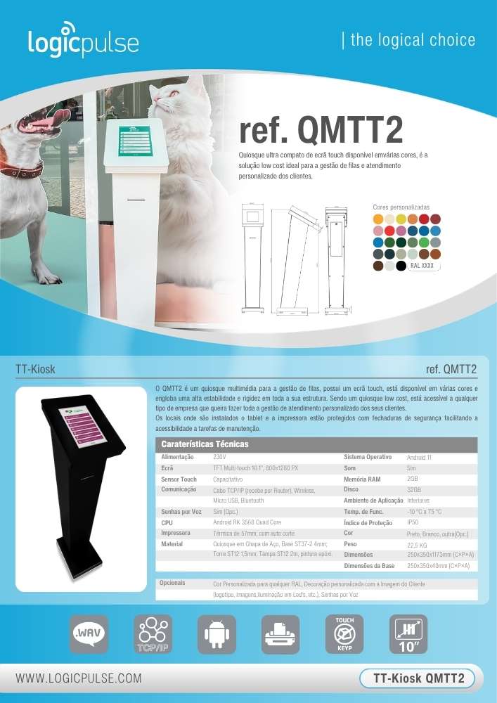Le QMTT2 est un kiosque multimédia pour la gestion des files d’attente, il dispose d’un écran tactile, est disponible en plusieurs couleurs et offre une grande stabilité et rigidité sur toute sa structure. En tant que kiosque économique, il est accessible à toute entreprise souhaitant gérer entièrement le service personnalisé de ses clients. Les emplacements où sont installés la tablette et l’imprimante sont protégés par des serrures de sécurité facilitant l’accès aux tâches de maintenance.