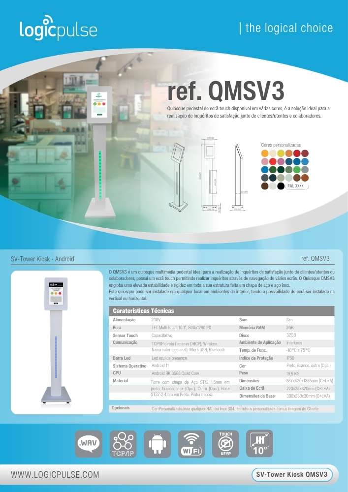 Le QMSV3 est un kiosque multimédia sur pied idéal pour la réalisation d’enquêtes de satisfaction auprès de clients/usagers ou collaborateurs, équipé d’un écran tactile permettant de réaliser des enquêtes via la navigation entre plusieurs écrans. Le kiosque QMSV3 présente une grande stabilité et rigidité dans toute sa structure fabriquée en tôle d’acier et acier inoxydable. Ce kiosque peut être installé dans n’importe quel endroit en environnements intérieurs, avec la possibilité d’installer l’écran en position verticale ou horizontale.
