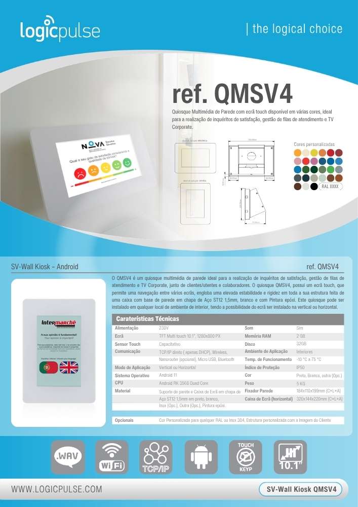 Le QMSV4 est un kiosque multimédia mural idéal pour la réalisation d’enquêtes de satisfaction, la gestion de files d’attente et la TV Corporate, auprès de clients/usagers et collaborateurs. Le kiosque QMSV4 possède un écran tactile qui permet une navigation entre plusieurs écrans, offrant une grande stabilité et rigidité grâce à toute sa structure fabriquée avec un boîtier mural en tôle d’acier ST12 de 1,5 mm, blanc, avec peinture époxy. Ce kiosque peut être installé dans n’importe quel environnement intérieur, avec la possibilité d’installer l’écran en position verticale ou horizontale.