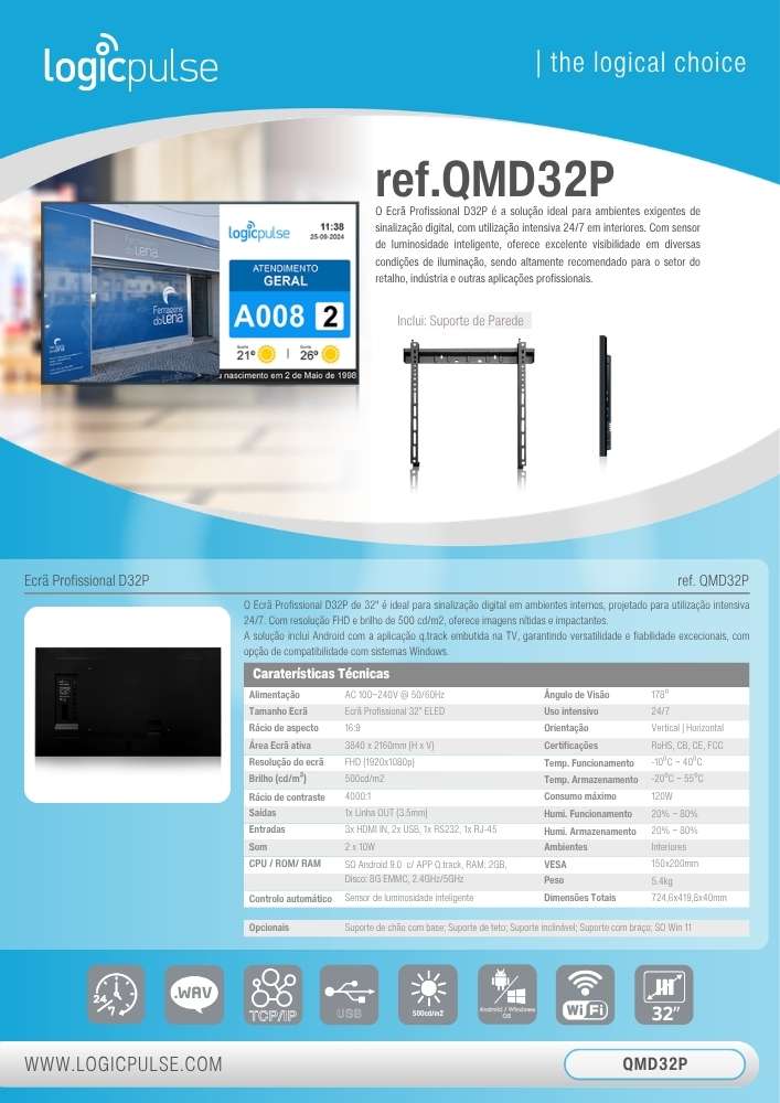 O Ecrã Profissional D32P de 32" é ideal para sinalização digital em ambientes internos, projetado para utilização intensiva 24/7. Com resolução FHD e brilho de 500 cd/m2, oferece imagens nítidas e impactantes. A solução inclui Android com a aplicação q.track embutida na TV, garantindo versatilidade e fiabilidade excecionais, com opção de compatibilidade com sistemas Windows.