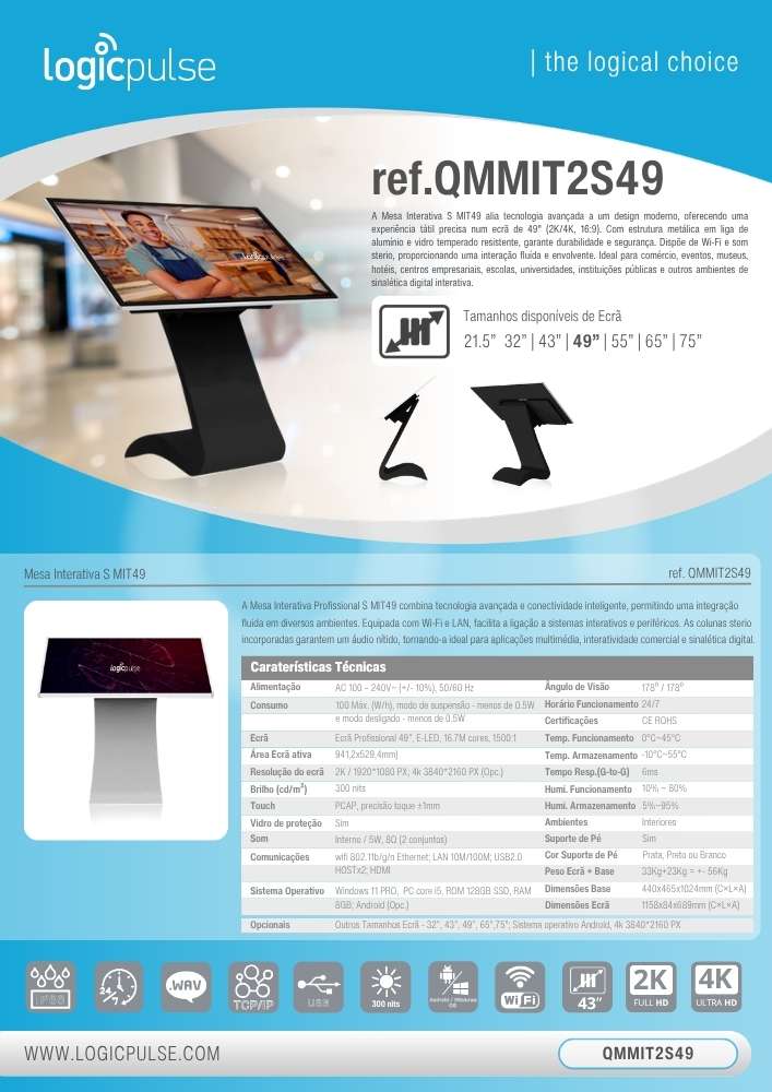 A Mesa Interativa Profissional S MIT49 combina tecnologia avançada e conectividade inteligente, permitindo uma integração fluida em diversos ambientes. Equipada com Wi-Fi e LAN, facilita a ligação a sistemas interativos e periféricos. As colunas sterio incorporadas garantem um áudio nítido, tornando-a ideal para aplicações multimédia, interatividade comercial e sinalética digital.