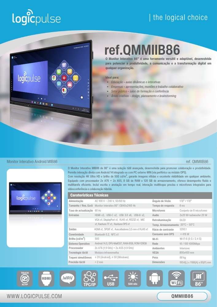 O Monitor Interativo MIB86 de 86” é uma solução tátil avançada, desenvolvida para promover colaboração e produtividade. Permite interação direta com Android 14 integrado ou com PC externo WIN (via periférico ou módulo OPS). Com resolução 4K Ultra HD e brilho de 500 cd/m², garante imagens nítidas e excelente visibilidade em qualquer ambiente. Equipado com processador 2x A76 + 2x A55, 8 GB de RAM e 128 GB de armazenamento, oferece desempenho fluido e multitarefa eficiente. Inclui escrita e anotação em tempo real, interação multitoque precisa e microfones integrados para videoconferência e colaboração híbrida.