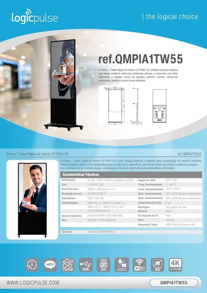 O Pórtico / Totem Digital de Interior LP PDIA1 55 combina robustez industrial com design moderno, ideal para ambientes urbanos e comerciais com ótima visibilidade e impacto visual em espaços públicos, centros comerciais, restauração, eventos e outros locais interiores.