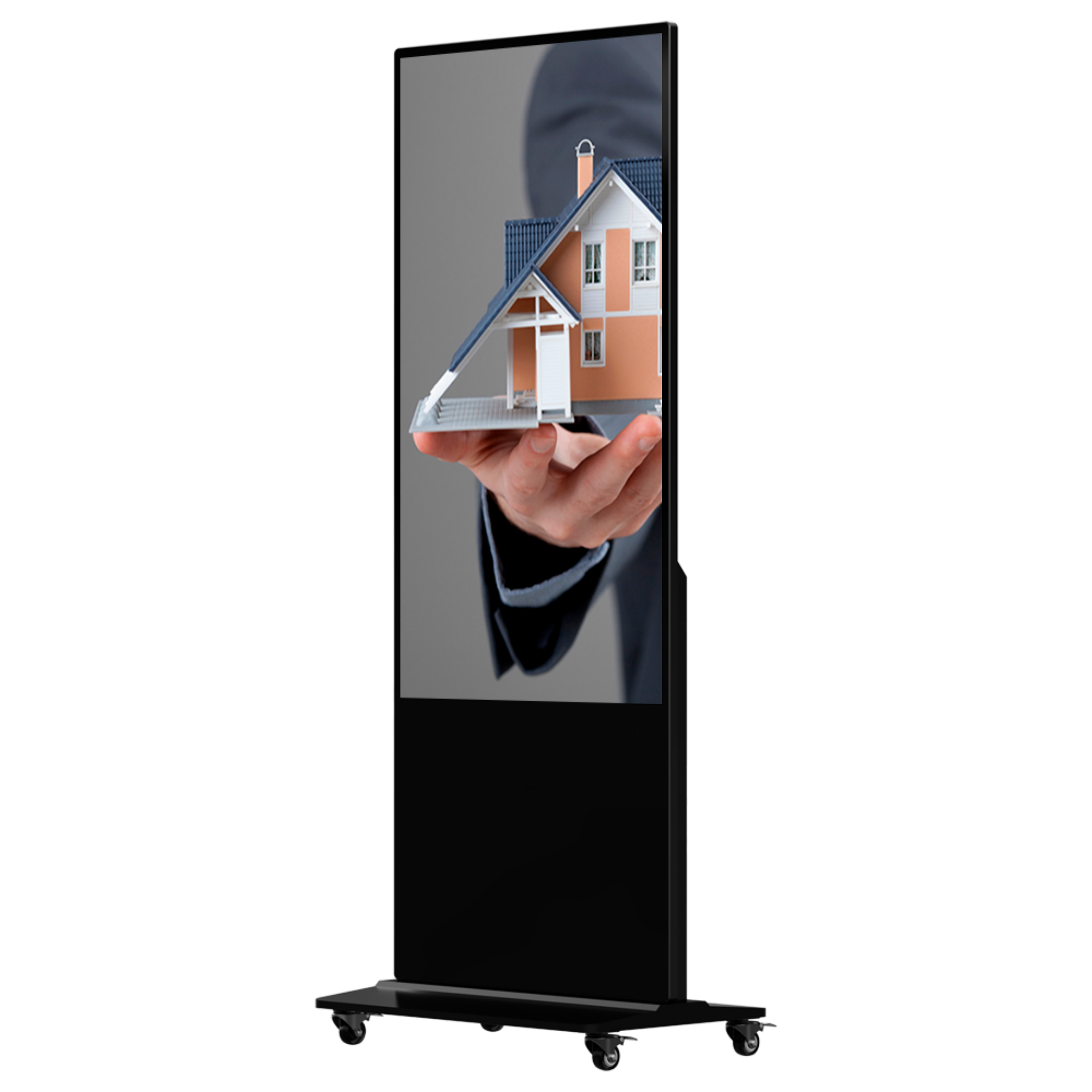 Com instalação de pé, combina design, estabilidade e eficiência, sendo ideal para publicidade e informação.