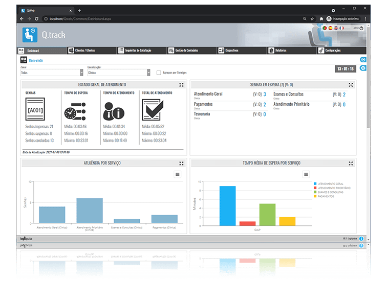 Dashboard com informações em tempo real com gráficos de afluência por serviço, afluência por localização, tempo média de espera por serviço, tempo média de espera por utilizador e afluência diária;